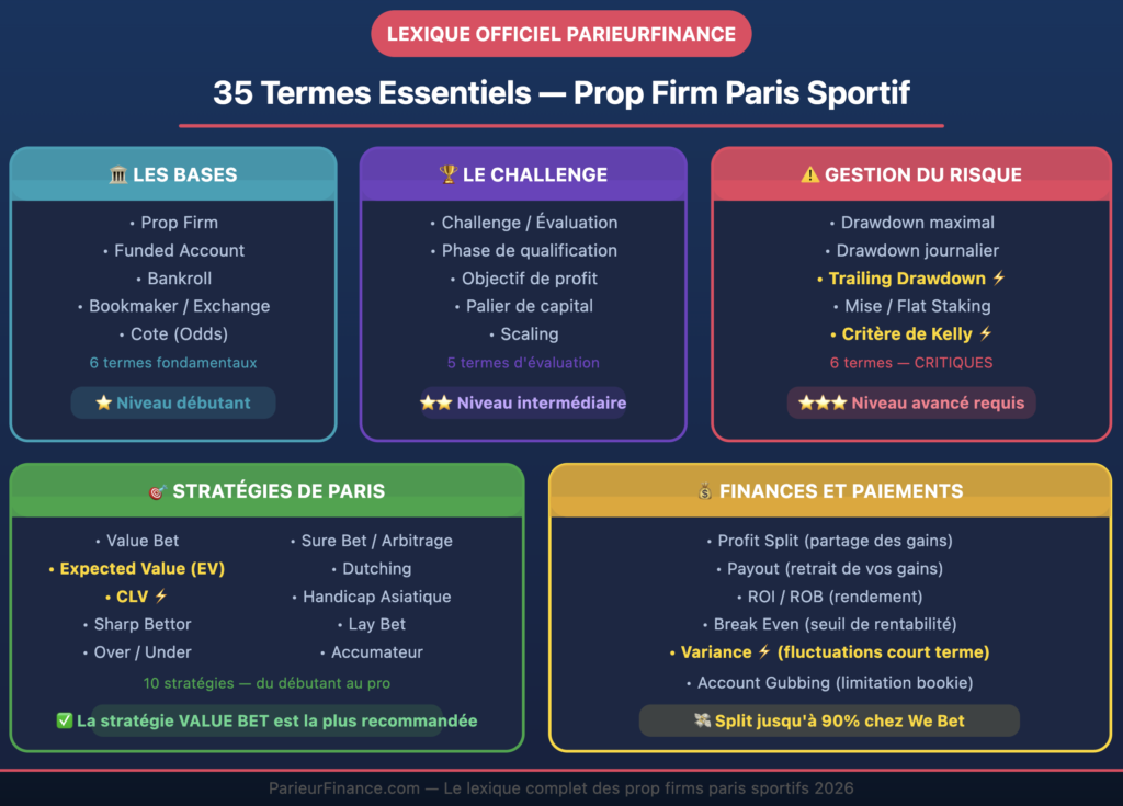 Lexique Prop Firm Paris Sportif : 35 Termes Essentiels (2026) | ParieurFinance